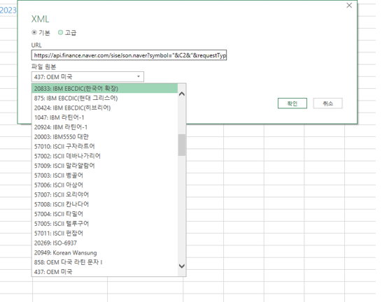 웹 데이터 불러오기 후, '파일열기형식' 옵션이 보이지 않을 경우