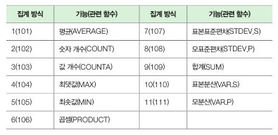 ① 1(101) : AVERAGE② 3(103) : COUNTA③ 9(109) : SUM - 다음 보기 중, 합계를 구하는 SUBTOTAL 함수의 집계방식은 무엇인가요?