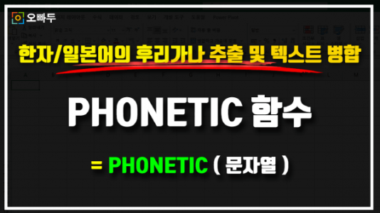 엑셀 PHONETIC 함수 사용법 및 공식 총정리 엑셀 PHONETIC 함수 목차 바로가기 함수 요약 PHONETIC 함수 구문 인수 알아보기 PHONETIC 함수 상세설명 PHONETIC 함수 사용법 간단예제 예제파일 다운로드 그 외 참고사항 함수 요약 엑셀 PHONETIC 함수는 한자/일본어의 윗주(후리가나)를 추출하는 함수입니다. 그 외의 문자(한글, 영어)는 기존 문자를 그대로 반환합니다. 함수 구문 = PHONETIC ( 문자열 ) ... 더보기 >>