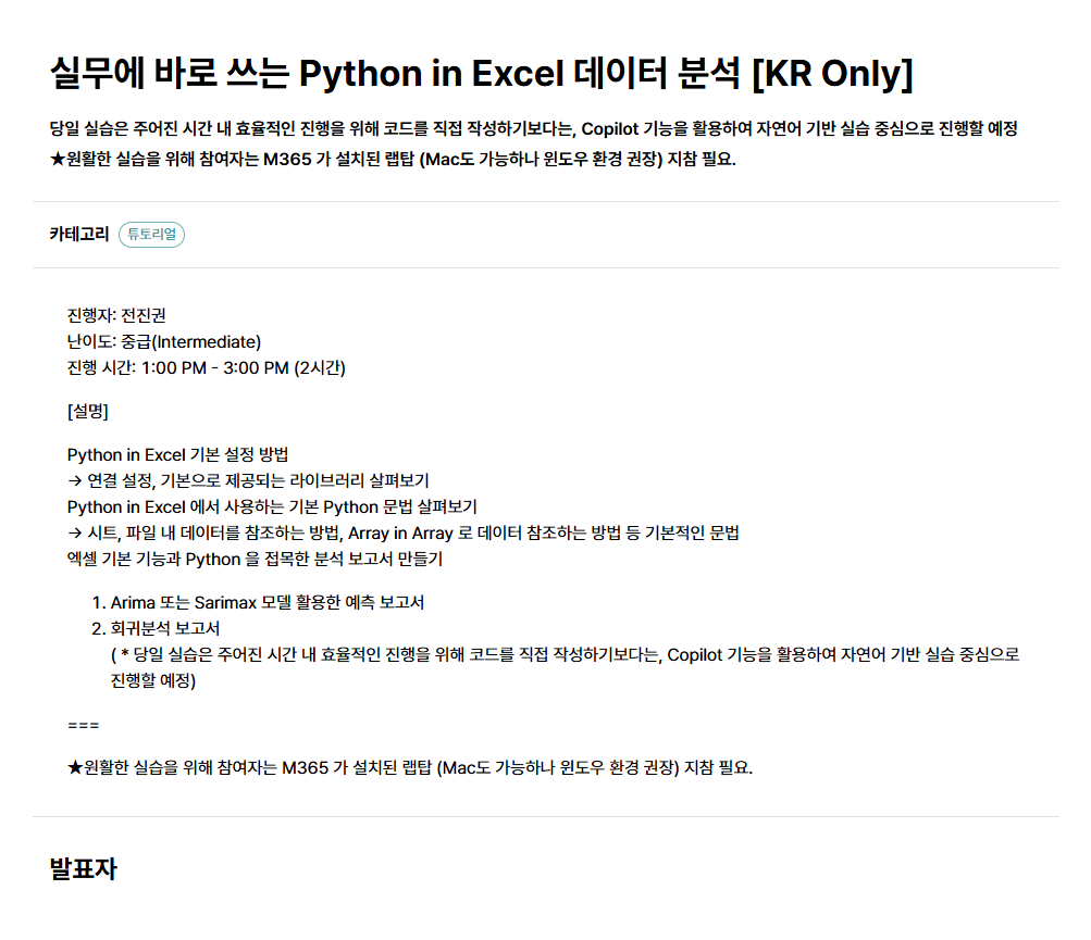 '실무에 바로 쓰는 Python in Excel 데이터 분석' 튜토리얼 연사로 참여하게 되었습니다.
