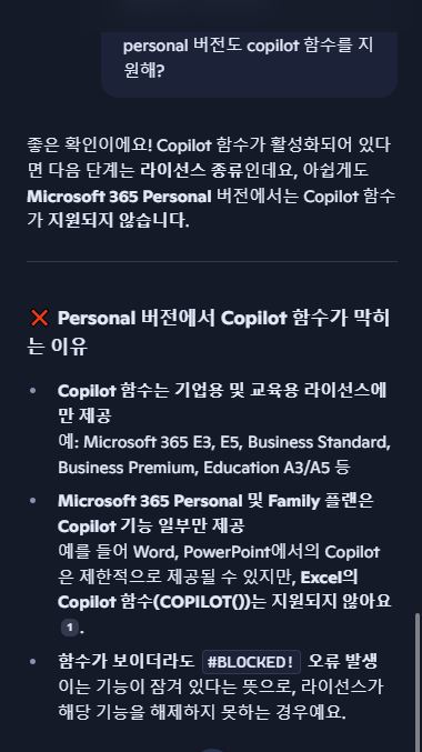 COPILOT 함수는 제가 보기엔 기업용 + 코파일럿 라이선스가 있으면 베타채널에서 모두 제공되는 것 같습니다.