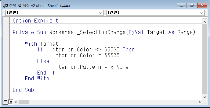 (방금 선택한 셀을 바로 재선택하면 색상 해제 안됨==>다른 셀(셀B) 선택 후 다시 원래 셀(셀A) 선택하면 셀A 색상 해제