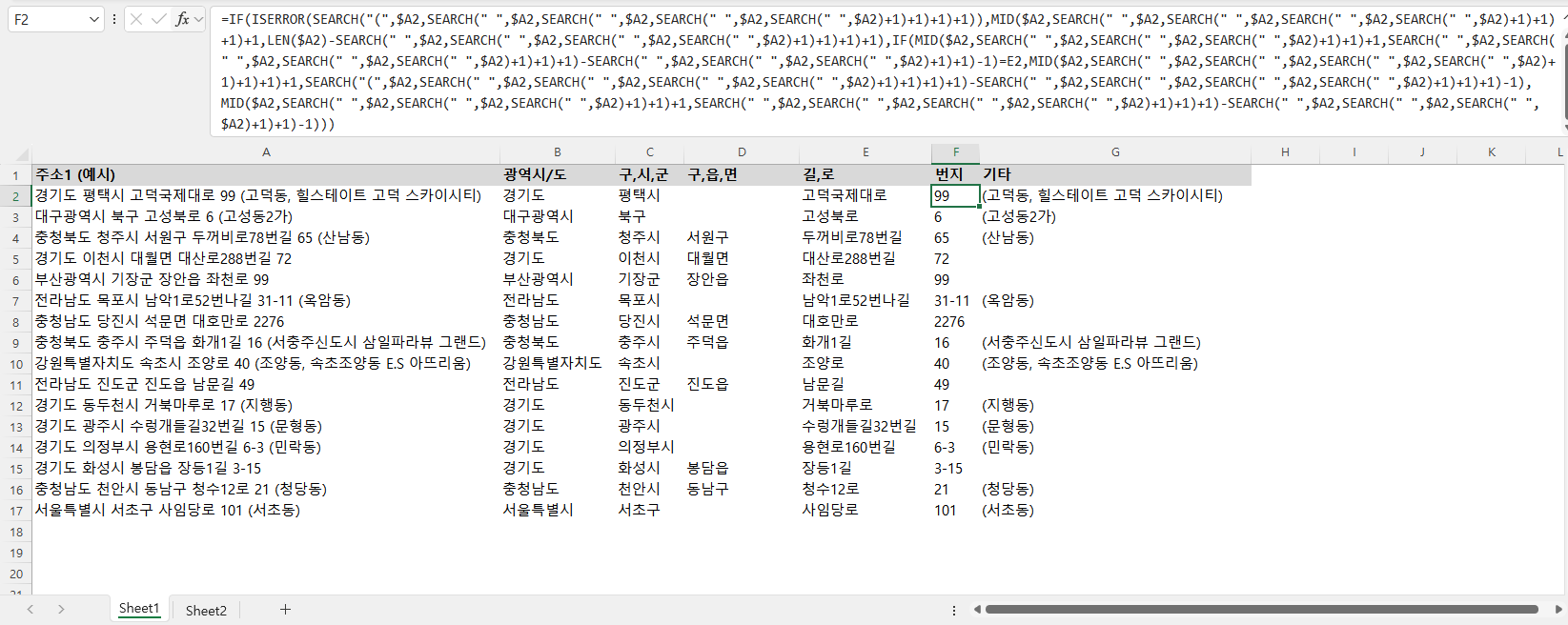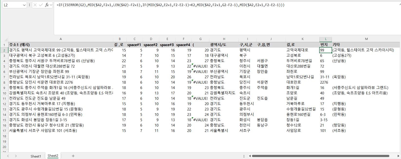구,시,군 C2 =MID($A2,SEARCH(" ",$A2)+1,SEARCH(" ",$A2,SEARCH(" ",$A2)+1)-SEARCH(" ",$A2)-1)