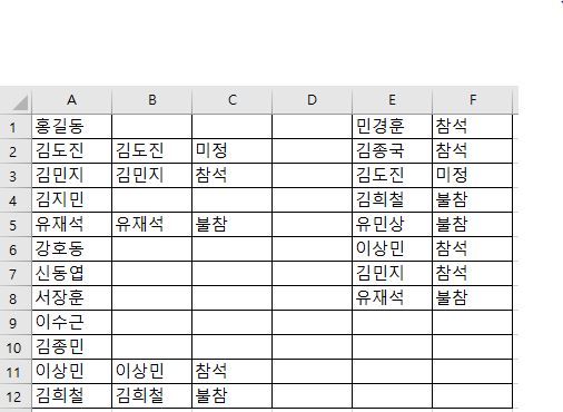 A열과 E열에 이름리스트가 있는데 중복이 되는 이름 리스트가 있습니다.