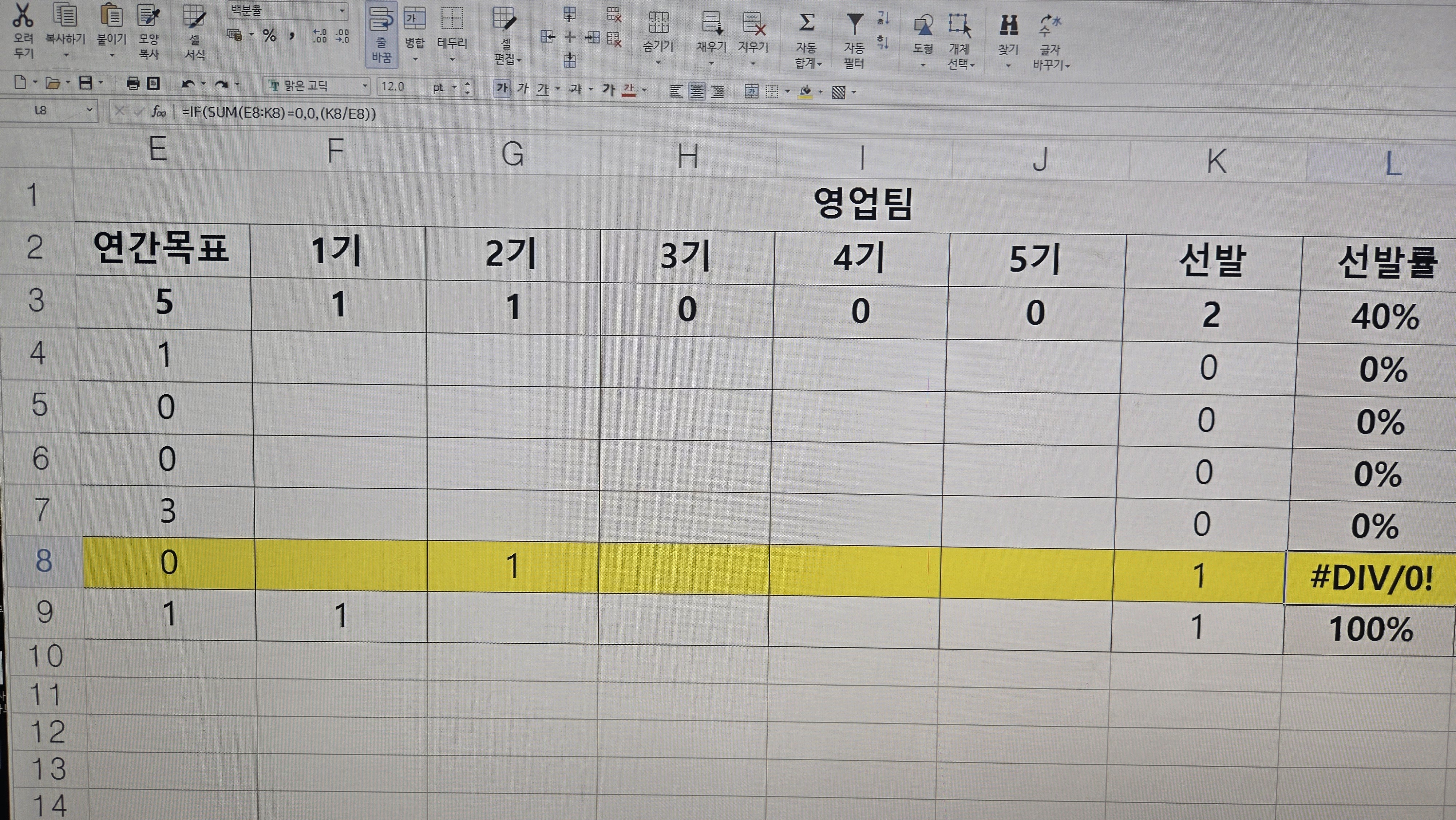 =IFERROR(기존수식,"연간목표가 0임")