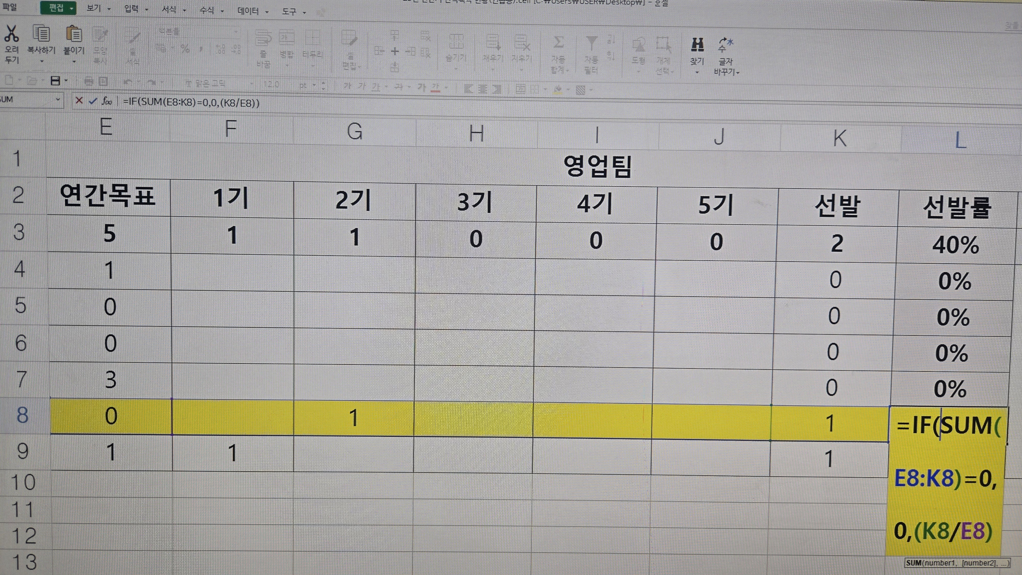 2. 노랑색 음영처리 하는 부분에 연간 목표가 0 인데 목표에 없는 1명이 선발이 되었습니다.