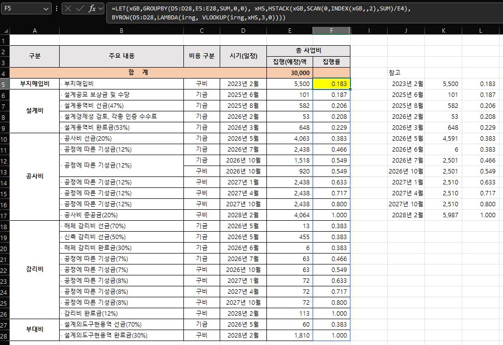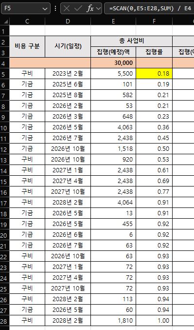 F5 =(SUMIFS(E$5:E$28,$D$5:$D$28,"<"&$D5) + SUMIFS(E$5:E5,$D$5:$D5,$D5))/E$4 대충 이렇게 냈는데, (전월까지의 누계+행기준당월누적행금액)를 총액으로 나눈 값입니다. 즉, 같은 월이라면 전월까지 누계 + 입력된 순서대로 누계가 됩니다.