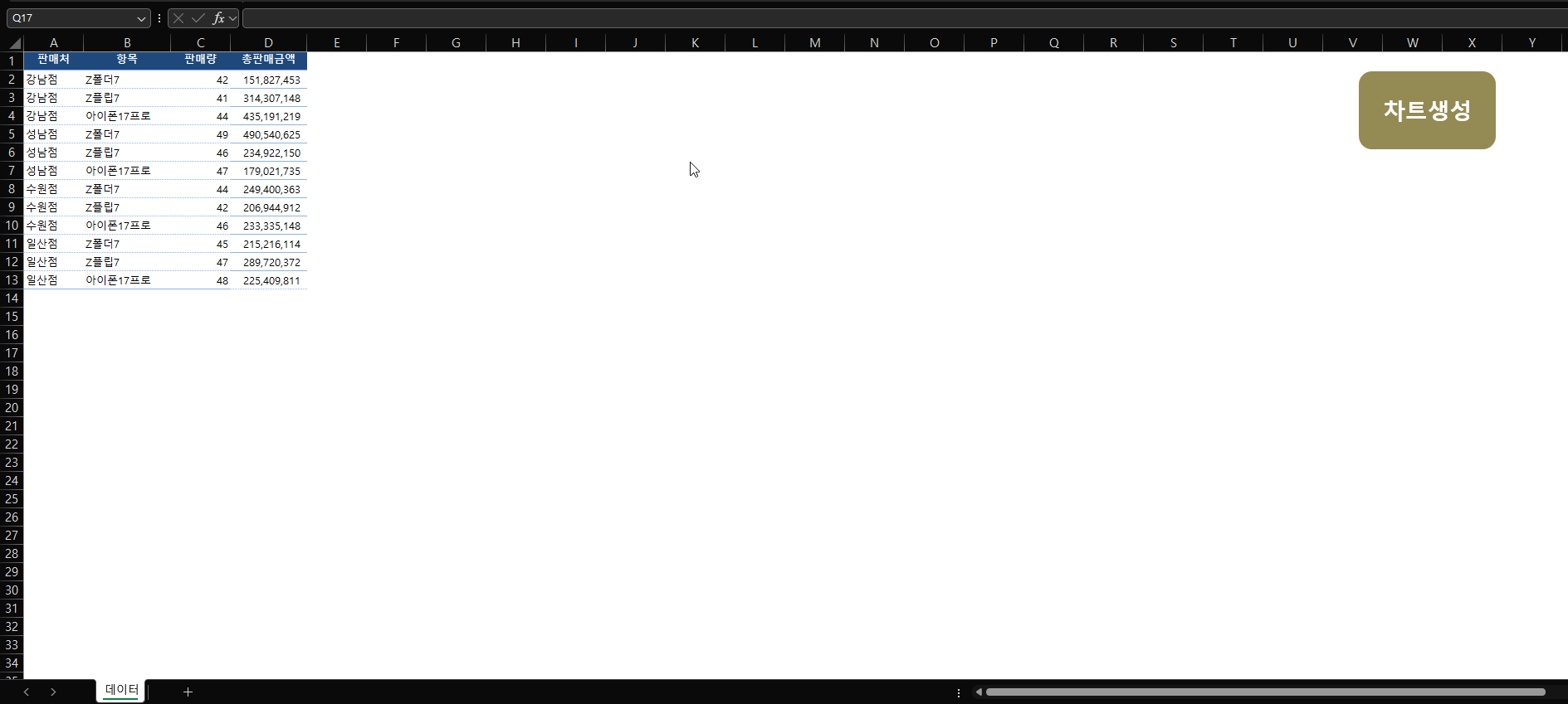 Option Explicit Public Sub 차트생성() '// ---------------- 시트/마지막행 ---------------- Dim ws As Worksheet: Set ws = ActiveSheet Dim eRow As Long: eRow = ws.Cells(ws.Rows.Count, "A").End(xlUp).Row If eRow < 2 Then MsgBox "데이터가 없습니다.", vbExclamation: Exit Sub '// ---------------- 기준 선택 ---------------- Dim rngSel As Range, 기준 As String, useAmt As Boolean On Error Resume Next Set rngSel = Application.InputBox( _ Prompt:="C1=판매량, D1=총판매금액 중 하나의 셀을 클릭하세요", _ Title:="기준 선택", Type:=8) On Error GoTo 0 If rngSel Is Nothing Then Exit Sub If Not Application.Intersect(rngSel, ws.Range("C1")) Is Nothing Then 기준 = "판매량": useAmt = False ElseIf Not Application.Intersect(rngSel, ws.Range("D1")) Is Nothing Then 기준 = "총판매금액": useAmt = True Else MsgBox "반드시 C1 또는 D1 셀을 선택해야 합니다.", vbExclamation Exit Sub End If '// 기준 선택에서 사용할 열 번호 결정 Dim mCol As Long If useAmt Then mCol = 4 '// 총판매금액: D열 Else mCol = 3 '// 판매량: C열 End If '// ---------------- 지점 범위(비연속 허용) 선택 ---------------- Dim rSel As Range On Error Resume Next Set rSel = Application.InputBox( _ Prompt:="지점명이 들어있는 셀 범위를 선택하세요." & vbCrLf & _ "Ctrl 키를 누른 채로 여러 범위를 클릭/드래그하면 다중 선택됩니다.", _ Title:="지점 다중 선택(비연속 허용)", Type:=8) On Error GoTo 0 If rSel Is Nothing Then Exit Sub '// ---------------- 선택범위 → 지점 고유목록 ---------------- Dim dBr As Object: Set dBr = CreateObject("Scripting.Dictionary") Dim ar As Range, c As Range, br As String For Each ar In rSel.Areas For Each c In ar.Cells br = Trim$(CStr(c.Value)) If Len(br) > 0 Then dBr(br) = 1 Next c Next ar If dBr.Count = 0 Then MsgBox "선택 범위에 지점명이 없습니다.", vbExclamation: Exit Sub '// ---------------- 원본에 실제 존재하는 지점만 남기기 ---------------- Dim dExist As Object: Set dExist = CreateObject("Scripting.Dictionary") Dim i As Long For i = 2 To eRow br = CStr(ws.Cells(i, 1).Value) If Len(br) > 0 Then dExist(br) = 1 Next Dim brs() As String, nBr As Long, k As Variant ReDim brs(1 To dBr.Count) For Each k In dBr.Keys If dExist.Exists(k) Then nBr = nBr + 1 brs(nBr) = CStr(k) End If Next If nBr = 0 Then MsgBox "선택한 지점이 원본 데이터에 없습니다.", vbExclamation: Exit Sub ReDim Preserve brs(1 To nBr) '// ---------------- 축 최소/최대 입력 ---------------- Dim tMin As String, tMax As String, minAuto As Boolean, maxAuto As Boolean Dim vMin As Double, vMax As Double tMin = Application.InputBox("Y축 최소값 (빈칸 또는 'auto' = 자동)", "축 최소값", Type:=2) tMax = Application.InputBox("Y축 최대값 (빈칸 또는 'auto' = 자동)", "축 최대값", Type:=2) minAuto = (Len(Trim$(tMin)) = 0 Or LCase$(Trim$(tMin)) = "auto") maxAuto = (Len(Trim$(tMax)) = 0 Or LCase$(Trim$(tMax)) = "auto") If Not minAuto Then If Not IsNumeric(tMin) Then MsgBox "최소값이 숫자가 아닙니다.", vbExclamation: Exit Sub vMin = CDbl(tMin) End If If Not maxAuto Then If Not IsNumeric(tMax) Then MsgBox "최대값이 숫자가 아닙니다.", vbExclamation: Exit Sub vMax = CDbl(tMax) End If If (Not minAuto And Not maxAuto) Then If vMax <= vMin Then MsgBox "최대값은 최소값보다 커야 합니다.", vbExclamation: Exit Sub End If '// ---------------- 차트 모드 선택: 0=개별차트, 1=전체차트 ---------------- Dim modeSel As Variant, isCombined As Boolean, modeVal As Long modeSel = Application.InputBox("차트 모드 선택: 0=개별차트, 1=전체차트", "차트 모드", 1, Type:=1) '// 취소 시 종료 If VarType(modeSel) = vbBoolean Then Exit Sub '// 숫자 보장 및 검증 modeVal = CLng(modeSel) If modeVal <> 0 And modeVal <> 1 Then MsgBox "0 또는 1만 입력하세요.", vbExclamation: Exit Sub End If isCombined = (modeVal = 1) '// ===== 성능옵션 ===== Dim sc As Boolean, ev As Boolean, calc As XlCalculation sc = Application.ScreenUpdating ev = Application.EnableEvents calc = Application.Calculation Application.ScreenUpdating = False Application.EnableEvents = False Application.Calculation = xlCalculationManual On Error GoTo XIT '// ---------------- 카테고리(모델) 목록: 등장순 유지 ---------------- Dim dItm As Object: Set dItm = CreateObject("Scripting.Dictionary") Dim itm As String For i = 2 To eRow If InArray(CStr(ws.Cells(i, 1).Value), brs) Then itm = CStr(ws.Cells(i, 2).Value) If Len(itm) > 0 Then If Not dItm.Exists(itm) Then dItm.Add itm, dItm.Count + 1 End If End If Next If dItm.Count = 0 Then MsgBox "선택 지점에 해당하는 항목이 없습니다.", vbExclamation: GoTo XIT Dim cats() As String, nCat As Long: nCat = dItm.Count ReDim cats(1 To nCat) For Each k In dItm.Keys cats(dItm(k)) = CStr(k) Next '// ---------------- 값 배열 구성 (지점 r, 항목 j) ---------------- Dim vals() As Variant, r As Long, j As Long, v As Variant ReDim vals(1 To nBr, 1 To nCat) For r = 1 To nBr For j = 1 To nCat: vals(r, j) = 0: Next j Next r For i = 2 To eRow br = CStr(ws.Cells(i, 1).Value) If InArray(br, brs) Then itm = CStr(ws.Cells(i, 2).Value) If dItm.Exists(itm) Then j = dItm(itm) r = FindIndex(brs, br) If r > 0 Then v = ws.Cells(i, mCol).Value '// 선택 열 원값 그대로 If IsNumeric(v) And Len(v) > 0 Then vals(r, j) = CDbl(v) '// 덮어쓰기 Else vals(r, j) = 0 End If End If End If End If Next i If isCombined Then '// ========== 전체차트(한 개) ========== Const CH_NAME As String = "매장차트" Dim co As ChartObject, ch As Chart On Error Resume Next Set co = ws.ChartObjects(CH_NAME) On Error GoTo XIT If co Is Nothing Then Set co = ws.ChartObjects.Add(Left:=400, Top:=60, Width:=820, Height:=380) co.Name = CH_NAME End If Set ch = co.Chart ch.ChartType = xlColumnClustered Do While ch.SeriesCollection.Count > 0 ch.SeriesCollection(1).Delete Loop For r = 1 To nBr With ch.SeriesCollec
