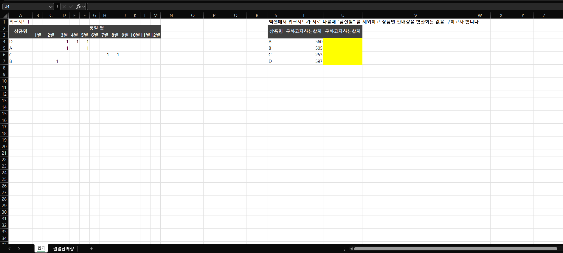 | 워크시트1 | 엑셀에서 워크시트가 서로 다를때 "품절월" 를 제외하고 상품별 판매량을 합산하는 값을 구하고자 합니다 | |||||||||||||||||||||