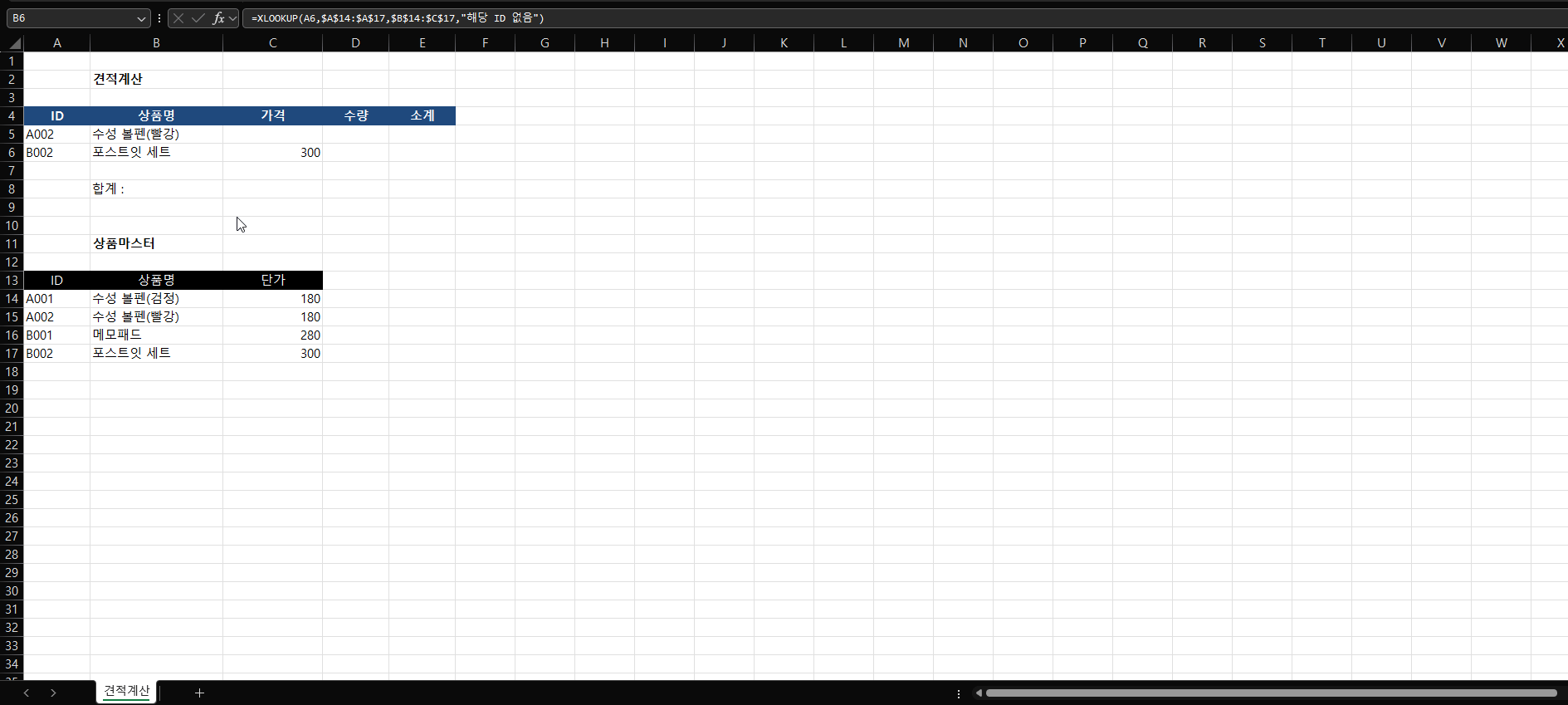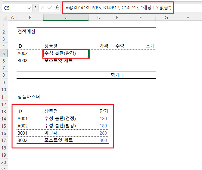=@XLOOKUP(A5,$A$14:$A$17,$B$14:$C$17,"해당 ID 없음")