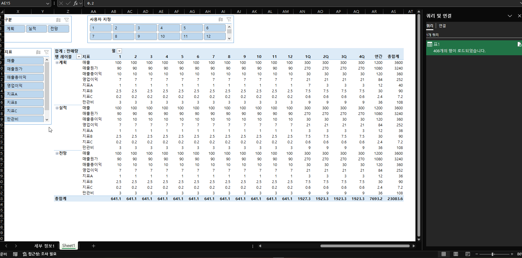 Sub 테스트() If RefreshPowerQuerySafely("표1") Then MsgBox "리프레시 성공!", vbInformation Else MsgBox "리프레시 실패. 로그를 확인하세요.", vbCritical End If End Sub감사합니다. 알고 보니 로드된 표를 다른 곳에 복사하는 과정에서 xlPasteAll을 쓴 게 문제였습니다. 답변 정말 감사합니다!!