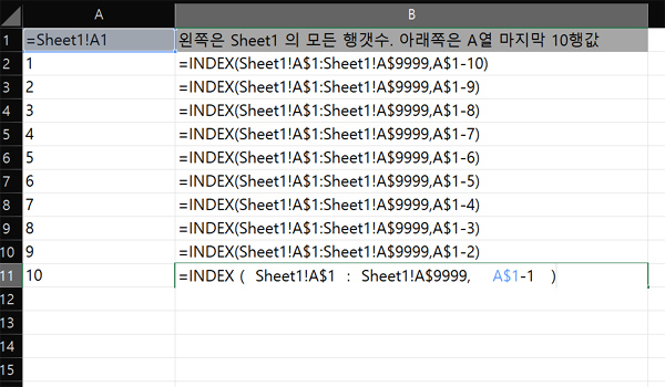 =INDEX(Sheet1!A$1 : Sheet1!A$9999, A$1-1 ) <-- 원래 수식. 이런 수식이 10개 있음.