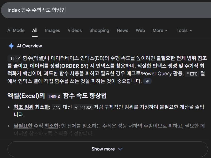 제가 무엇을 우선해야 하고 어떤 순서로 문제해결을 해야할 지를 잘 알려주신 것 같습니다. 체계적으로 공부하지 못하고 문제가 생길 때마다 그것을 해결하는 방식은 부분에서 전체를 이해하려는 시도이니 이는 분명히 잘못되었다는 것을 저도 느끼고 있었습니다. 저도 이제서야 INDEX에 대해서 좀 알게 되었는데, 인공지능이 A:A열 보다는 A1:A9999 로 범위를 잡아야 수행속도가 더 빠르다고 대답헤주니, 저는 당연히 INDEX 구동원리 안에는 A열을 카운트하는 과정이 있을 것이라는 추측을 하게된 건데, 이는 잘못된 추측이고 여기서부터 방향이 틀어져버린 것 같습니다.