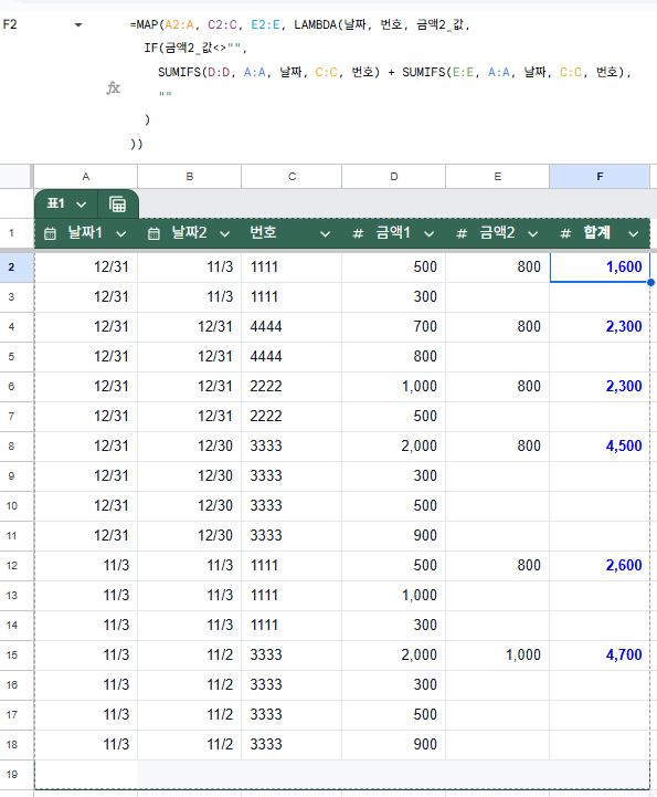 F2=MAP(A2:A, C2:C, E2:E, LAMBDA(날짜, 번호, 금액2_값, IF(금액2_값<>"", SUMIFS(D:D, A:A, 날짜, C:C, 번호) + SUMIFS(E:E, A:A, 날짜, C:C, 번호), "" ) ))2026년도에서 덕분에 일이 많이 간편해 지겠네요^^