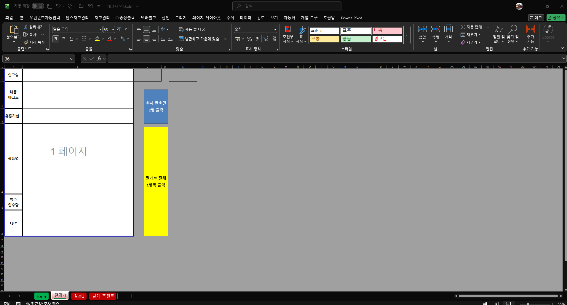 Option Explicit Public Sub 입고라벨출력() Dim ws As Worksheet, ws1 As Worksheet Dim eRow As Long, r As Long Dim a As Variant Set ws = ActiveSheet Set ws1 = ThisWorkbook.Worksheets("결과-1") eRow = ws.Cells(ws.Rows.Count, "B").End(xlUp).Row If eRow < 4 Then Exit Sub '// B4:G를 통째로 배열로 로드(1회 I/O) a = ws.Range("B4:G" & eRow).Value '// (1..n, 1..6) Application.ScreenUpdating = False For r = 1 To UBound(a, 1) '// 완전 빈 행 스킵(원치 않으면 삭제) If Application.WorksheetFunction.CountA(Application.Index(a, r, 0)) = 0 Then GoTo NX With ws1 .Range("B1").Value = a(r, 1) '// 입고일 (B) .Range("B4").Value = a(r, 2) '// 상품명 (C) .Range("B2").Value = a(r, 3) '// 내품바코드 (D) .Range("B5").Value = a(r, 4) '// 박스입수량 (E) .Range("B6").Value = a(r, 5) '// QTY (F) .Range("B3").Value = a(r, 6) '// 유통기한 (G) End With ws1.PrintPreview '// 실제 출력시에는 앞에 ' (어퍼스트로피) 추가 'ws1.PrintOut '// 실제 출력시에는 앞에 ' (어퍼스트로피) 제거 NX: Next r Application.ScreenUpdating = True MsgBox "라벨 출력 완료 (" & UBound(a, 1) & "건)", vbInformation End Sub답변 너무 감사드립니다!!!
