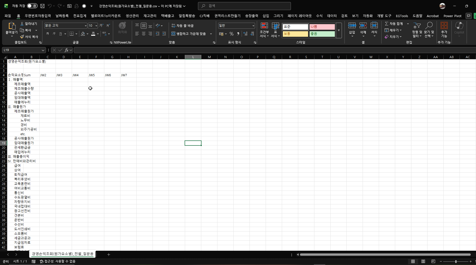 ERP에서 받은 파일은 CSV 파일로 수정, 기존 파일을 값으로 붙여넣기, 새로운 엑셀파일로 시도