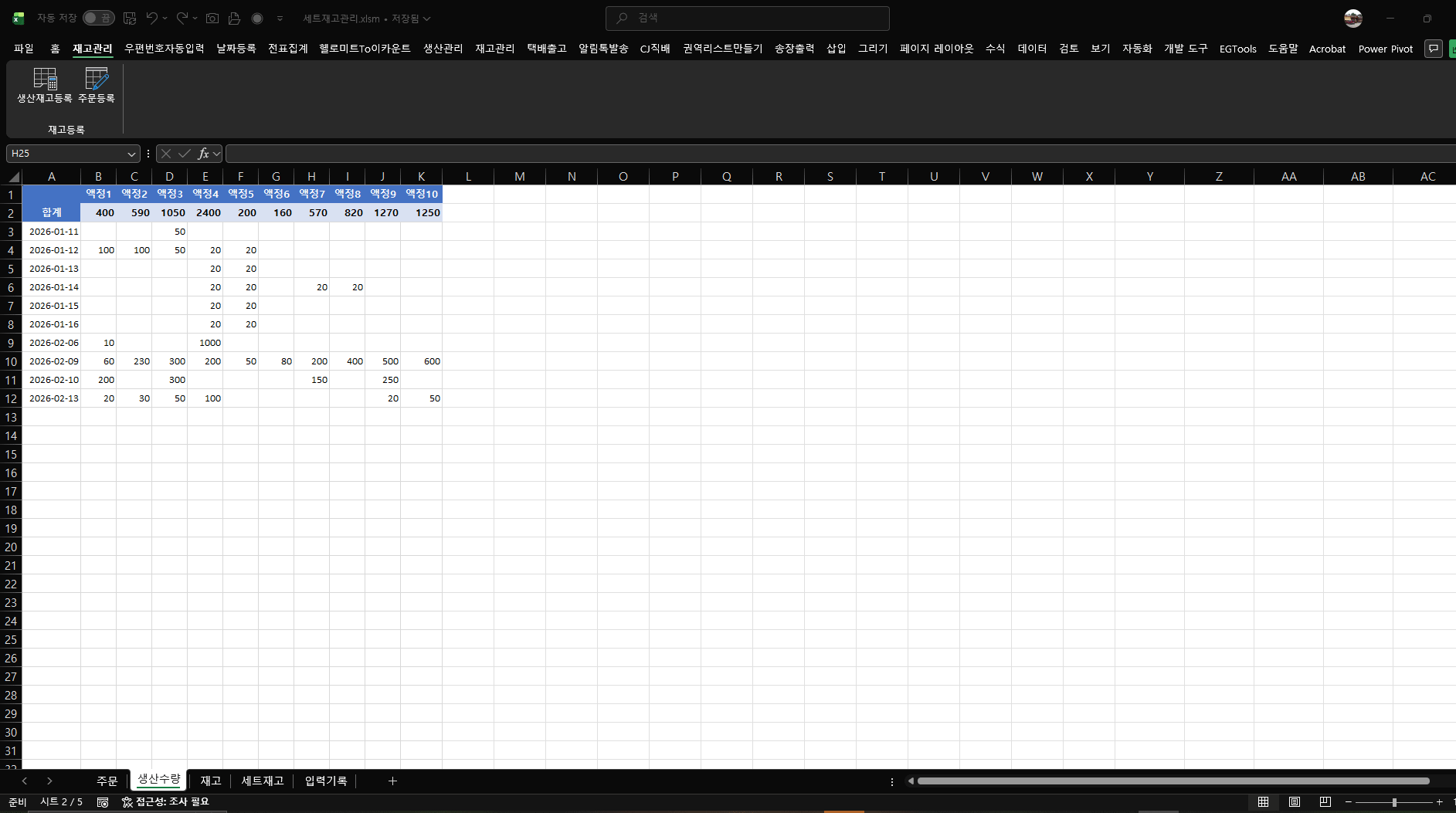 생산수량시트에 기록이 되고 합계가 증가됩니다.