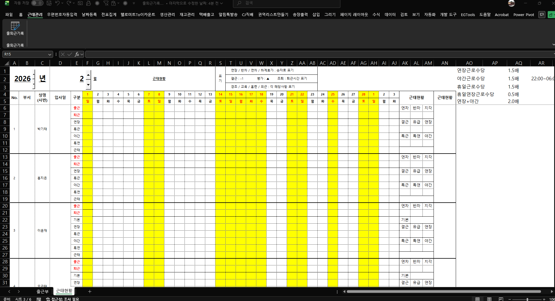 파일을 실행하면, 리본메뉴가 자동으로 생성됩니다.먼저 출근부 데이터는 항상 세로 방향으로 데이터를 쌓아야 합니다.