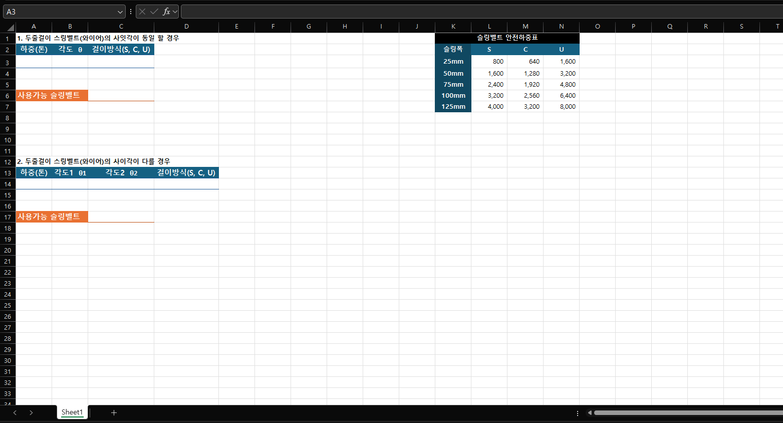 현장에서 사용하는 적합한 사용가능 슬링벨트 계산식 파일입니다.