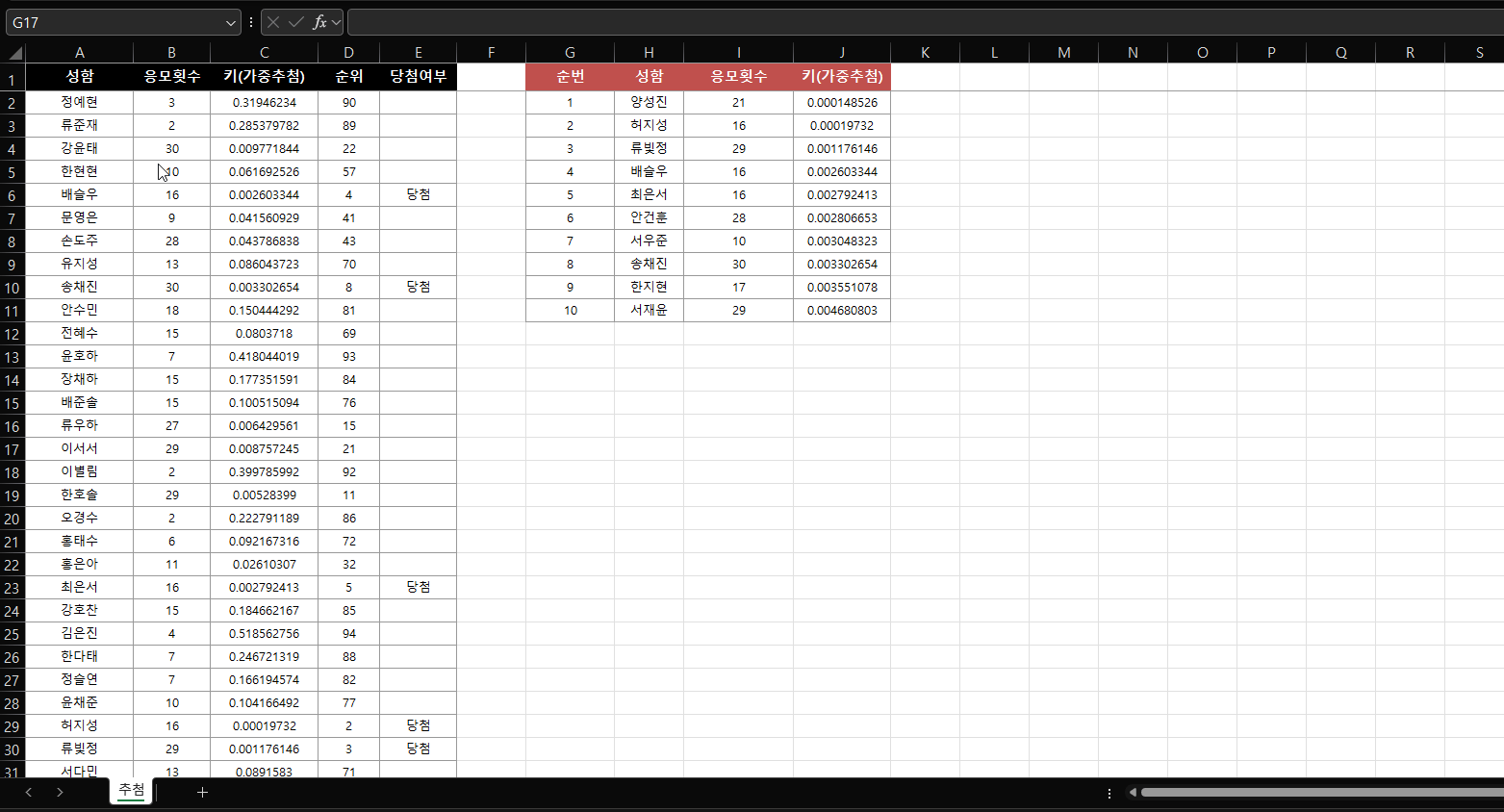 이를 위해 RAND()로 생성한 균등난수를 −LN(RAND()) 변환을 통해 지수분포 난수로 바꾸고, 그 값을 응모횟수로 나누어 최소값 경쟁 방식으로 당첨자를 결정하도록 해야 합니다.