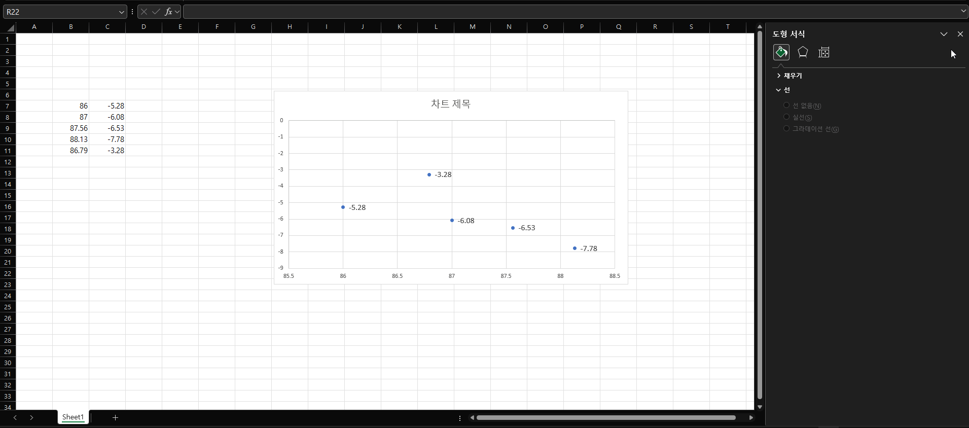 예를 들어 아래와 같이 분산형 차트를 그렸다고 가정했을 때