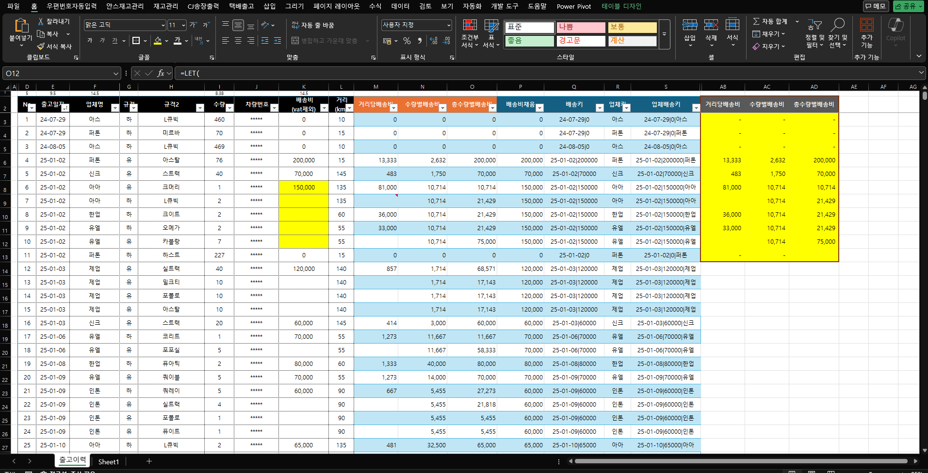 [배송비채움] P2=LET(x,$K3, IF(x<>"", x, LOOKUP(2,1/($K$3:K3<>""), $K$3:K3))) [배송키] Q2=TEXT($E3,"yy-mm-dd")&"|"&$P3 [업체키] R2=LET(x,$F3, TRIM(SUBSTITUTE(CLEAN(x),CHAR(160)," "))) [업체배송키] S2=$Q3&"|"&$R3