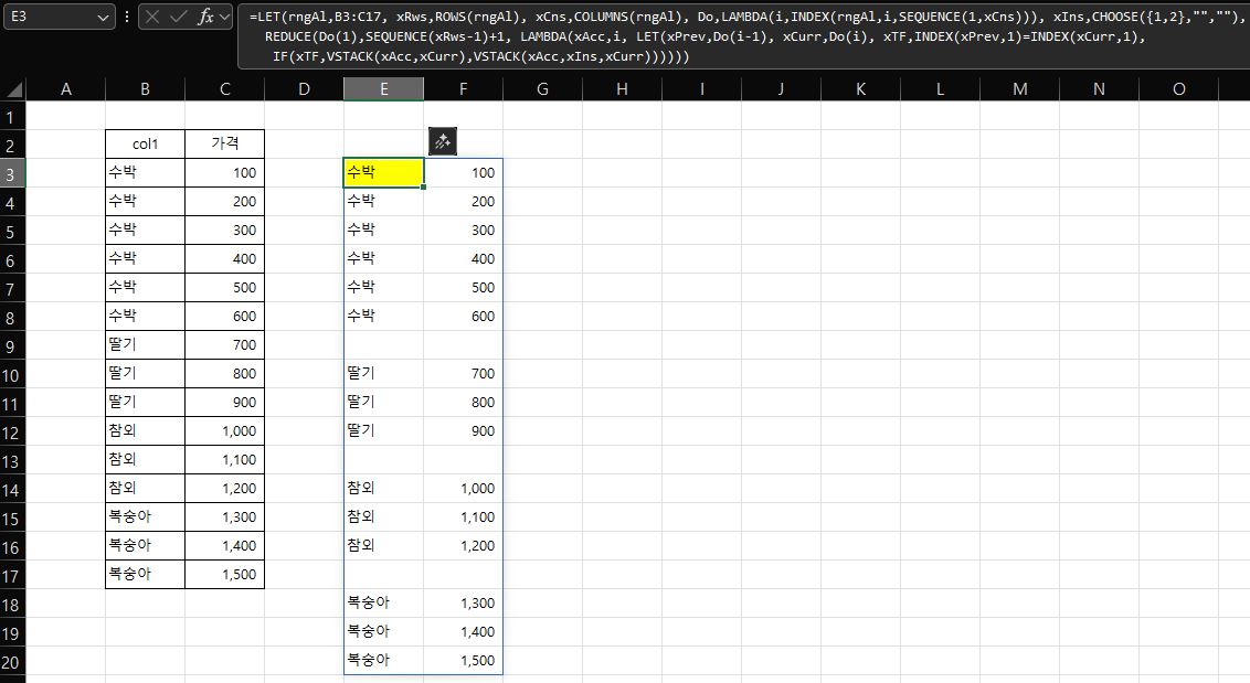Reduce로 누적마지막행과 현재행을 비교하여 바로 정리하는 방법도 가능하네요. =LET(DT,B2:C17, EXT, {"",""}, DROP(REDUCE(VSTACK(EXT,EXT),SEQUENCE(ROWS(DT)),LAMBDA(t,r, LET(X, TAKE(t,-1), VSTACK(DROP(t,-1),IF(INDEX(X,1,1)=INDEX(DT,r,1),X,VSTACK(X,EXT)),INDEX(DT,r,0)) ))),3))